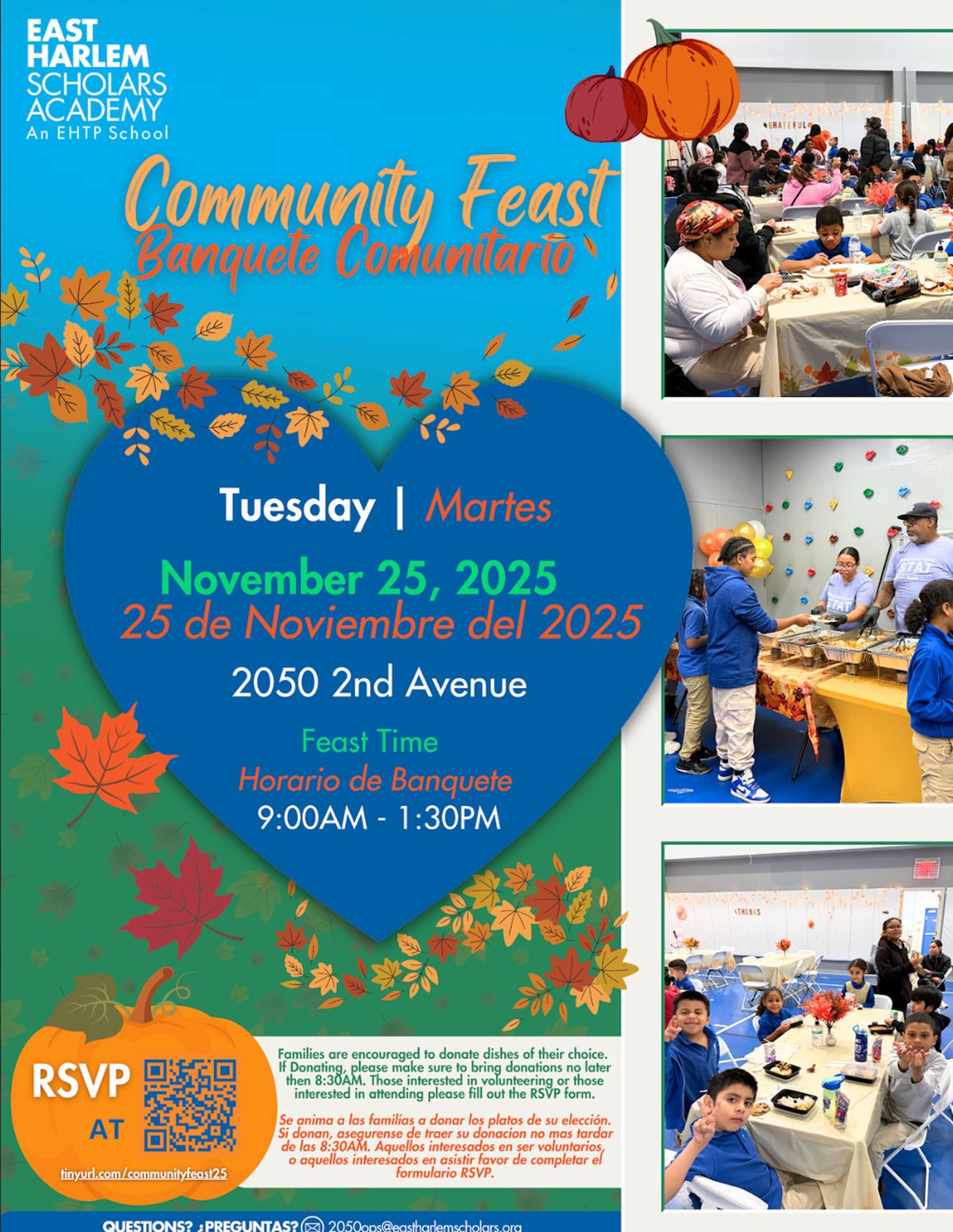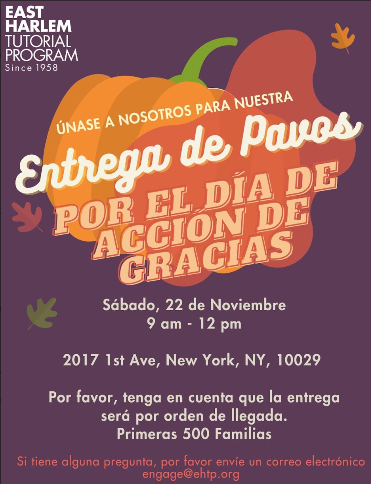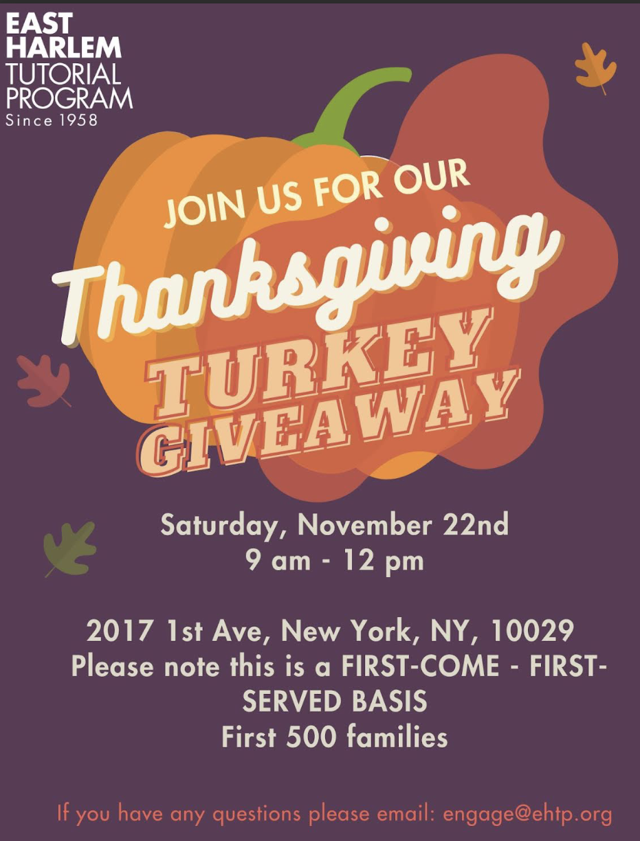 Event Details: Location: 2017 1st Avenue - East Harlem Scholars High School When: Saturday, November 22nd Time: 9:00 a.m. – 12:00 p.m. 500 Turkeys – First Come, First Served