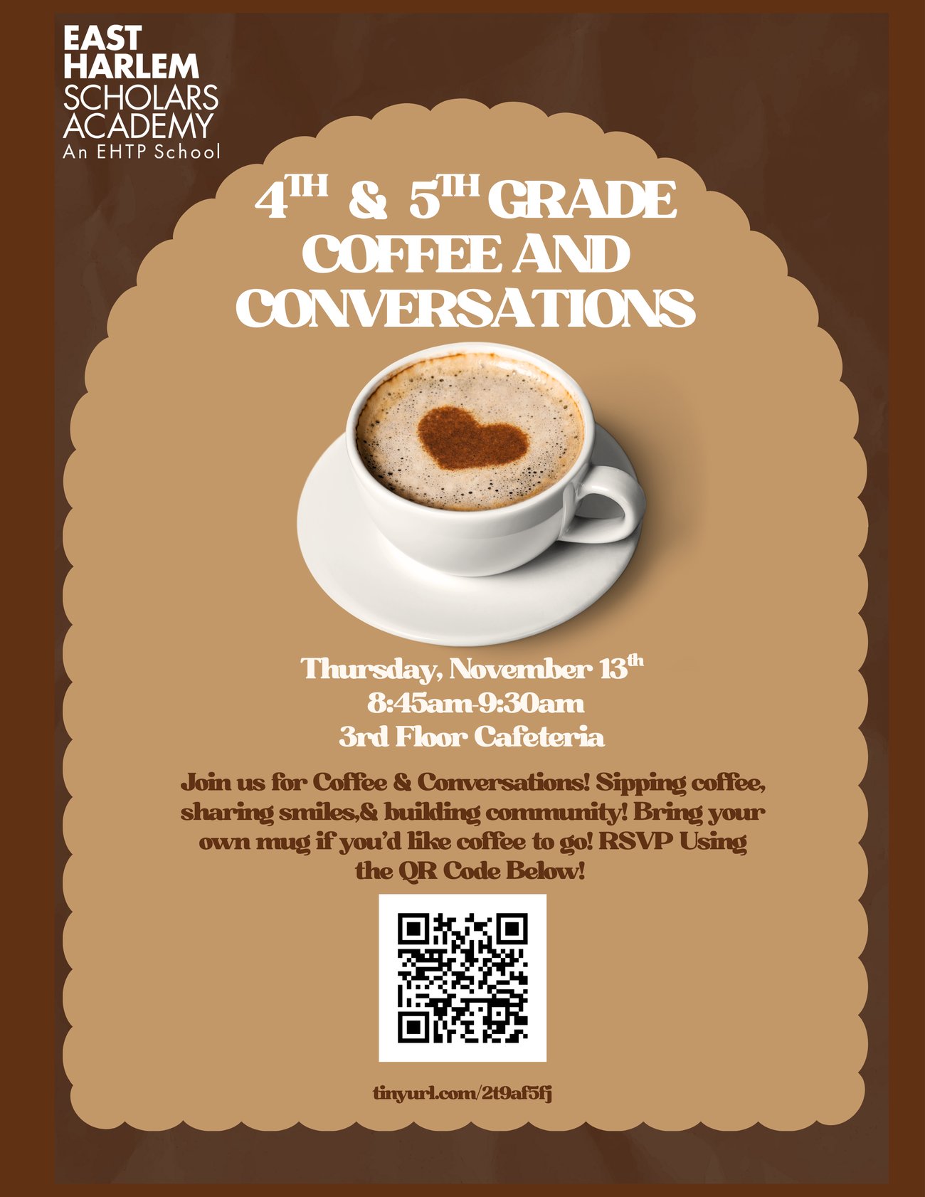 Café y Conversaciones" es una oportunidad acogedora para que nuestros estudiantes, padres y cuidadores se conecten, compartan y participen en un diálogo abierto con los líderes de la escuela. (UBICADO EN 2050, 2nd Ave.)
