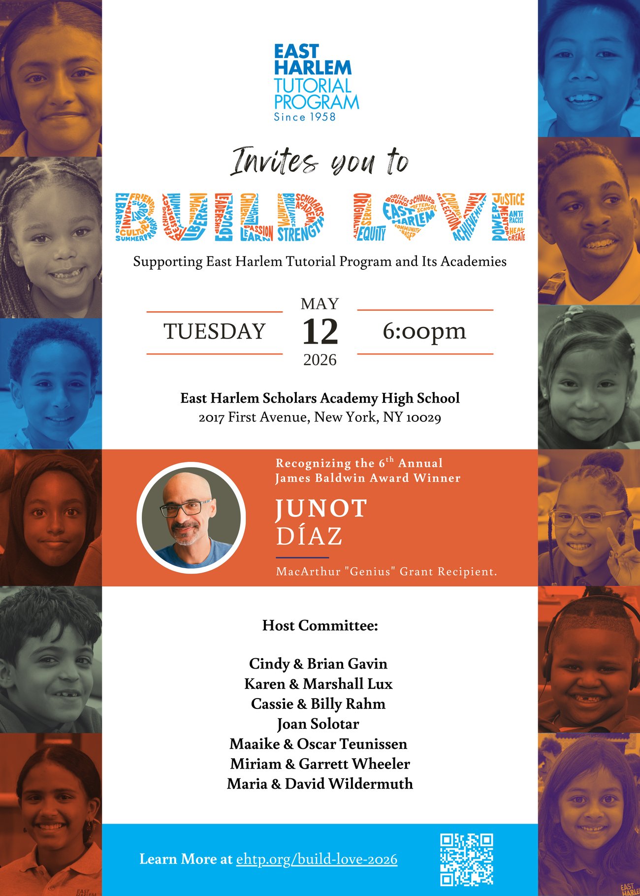 This year, we are proud to present the James Baldwin Award to Junot Dรญaz, whose storytelling has illuminated the complexities of identity, migration, and belonging. Through his powerful body of work and unwavering commitment to truth, Dรญaz exemplifies the spirit of Baldwinโchallenging systems, uplifting marginalized voices, and reminding us of the transformative power of literature. If you are interested in sponsoring the event and supporting our scholars, CLICK HERE or visit www.ehtp.org/build-love-2026
